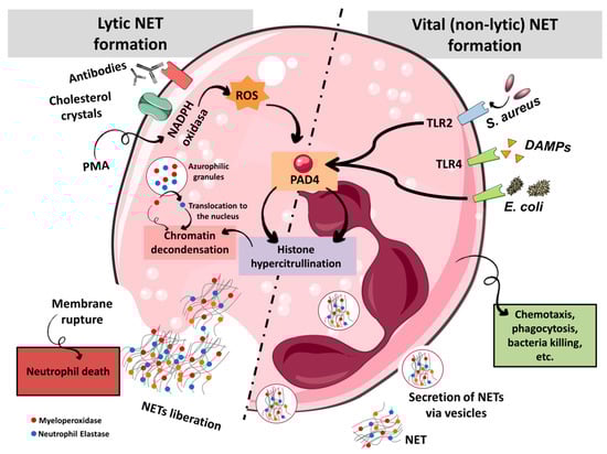 Neutrophils play a key role in the innate immune system where they represent the major leukocyte population in humans. After an infection or tissue damage, neutrophils are the first leukocytes that are recruited to the inflammatory site []. Indeed, it was thought for a long time that phagocytosis was the main neutrophil effector mechanism []. In 2004, Brinkmann et al. published a landmark study where they characterized a new mechanism, later named NETosis that is different from necrosis and apoptosis [], where neutrophils are able to eliminate bacteria during an infectious process by emptying their nuclear content into the extracellular space []. NETs are structures composed of nuclear chromatin and associated with nuclear histones with a high cytotoxic function, as well as cytoplasmic and granular antimicrobial proteins able to permeabilize cells []. The main function of NETs is to trap and eliminate pathogens avoiding their spread and allowing the concentration of antimicrobial elements at the infection site []. In vitro NET formation was first described after activating neutrophils with phorbol-12-myristate-13-acetate (PMA) []. This activation was shown to be NADPH oxidase-dependent process via protein kinase C and Raf-MEK-ERK with a concomitant calcium influx [] finally producing reactive oxygen species (ROS) (Figure 1). This pathway activates a relevant protein, protein-arginine deiminase IV (PAD4), that converts arginine, a positively charged aminoacid, into citrulline within histones and causing chromatin decondensation due to the disruption of the tight association linking histones with DNA []. On the other hand, ROS allow the translocation from cytoplasmic azurophilic granules to the nucleus of neutrophil elastase (NE), myeloperoxidase (MPO) and other related enzymes []. This translocation further triggers chromatin decondensation and NET formation through histone cleavage []. Finally, these processes lead to the loss of nuclear and plasmatic membranes integrity by mechanisms that are still largely unknown (for complete review on NET formation mechanisms refer to Thiam et al. []). However, NET formation not always requires cell death. Several scientific evidences point towards the existence of a parallel NET formation process with non-lytic characteristics known as vital NET formation that seems independent of NADPH oxidase [] (Figure 1). The mechanisms involved in vital NET formation are still elusive. Both vital NET formation and lytic NETosis share some similarities concerning the molecular pathways (NE translocation, PAD4 activation) although the nature of the stimulus [activation through toll like receptors (TLRs) or platelets], as well as the time required for NET to form are different []. Importantly, neutrophils undergoing non-lytic NET formation are still able to perform some important functions, such as phagocytosis [].
