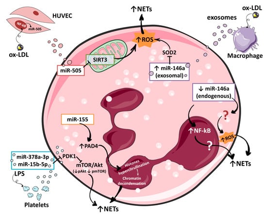 The next miRNA to be shown as a potential regulator of NET formation was miR-505. This miRNA has been involved in the development of different types of cancer such as breast cancer [] or pancreatic cancer []. Recently, its role in familial hypercholesterolemia has also been characterized showing that miR-505 controls the expression of several chemokine receptors conferring a pro-inflammatory status to patients with this disease []. In their work, Chen et al. confirmed that purified exosomes from plasma of patients with atherosclerosis contain higher levels of miR-505 vs. healthy controls []. Additionally, they observed that the incubation of HUVECs with ox-LDLs increased the transcription of miR-505 through a NF-κB dependent signal favoring the secretion of exosomes with high miR-505 content []. Furthermore, the interaction of these ox-LDL-induced exosomes with human purified neutrophils increased NET formation in vitro []. Finally, the authors explained the higher NETosis observed with a down-regulation of NAD-dependent deacetylase sirtuin-3 (SIRT3) by miR-505. SIRT3 is mitochondrial protein that has been implicated in the regulation of ROS production []. The authors hypothesized that miR-505 contained in exosomes from atherosclerotic patients are transferred to neutrophils where they downregulate SIRT3 allowing an uncontrolled ROS production that activate NETosis. Interestingly, miR-505 has been tightly linked to high mobility group box 1 protein (HMGB1) expression in different types of cancer [,]. How this regulatory pathway may also play a role in NET formation in a cardiovascular context given the essential function of HMGB1 in NETosis may be a point of interest for future studies [].