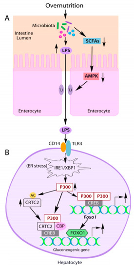 Overnutrition leads to increased gluconeogenic gene expression by altering gut microbiota and lipopolysaccharide (LPS) production. (A) Overnutrition alters the composition of gut microbiota and increases LPS production along with decreased short chain fatty acid (SCFA) levels. Decreased SCFAs lead to the impairment of AMPK activity in intestinal epithelial cells, resulting in leaky gut and endotoxemia. (B) Elevated LPS induces acetyltransferase P300 via activation of the IRE1-XBP1 pathway in the endoplasmic reticulum (ER) stress in hepatocytes. Induced P300 upregulates gluconeogenic gene expression by directly binding to CREB, acetylating CRTC2 to prevent its nuclear exclusion and degradation, and driving Foxo1 gene expression. FOXO1 can bind to the promoter of the gluconeogenic gene to further increase gluconeogenic gene expression. TJ: tight junction. The solid arrows indicate the direct effects, and the dashed arrow indicates indirect effects.