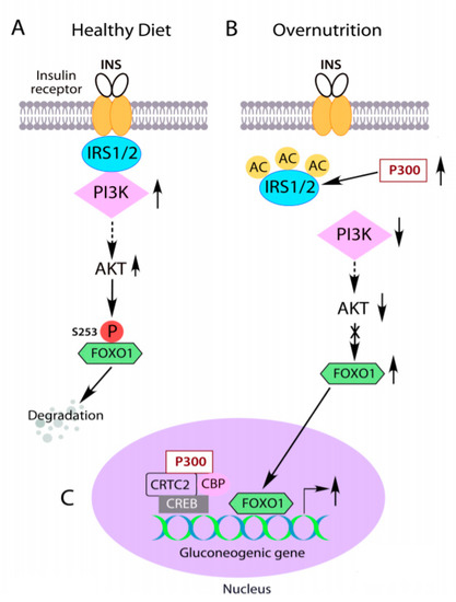 Moreover, in HFD-fed mice, depletion of liver P300 by shRNA significantly decreased liver glucose production, and the inhibition of P300 acetyltransferase by C646 or A-485 [62,63,64,65] significantly reduced glucose production in primary hepatocytes and the mRNA levels of G6pc [59,66]. Since the acetylation of CRTC2 by nuclear P300 reduces CRTC2 degradation [46], elevated P300 protein levels could augment gluconeogenic gene expression by increasing CRTC2 protein levels in HFD-fed mice (Figure 1B). Additionally, FOXO1 upregulates gluconeogenesis through activation of Pck1 and G6pc gene expression in the liver [67,68]. P300 can regulate the expression of the Foxo1 gene through binding to tandem cAMP-response element sites in the proximal promoter region of the Foxo1 gene [62]. Elevated nuclear P300 should also increase the expression of the Foxo1 gene in the liver of obese mice (Figure 1B). These data indicate that P300 is an important etiological factor for abnormal glucose production in the liver of T2D and obesity.