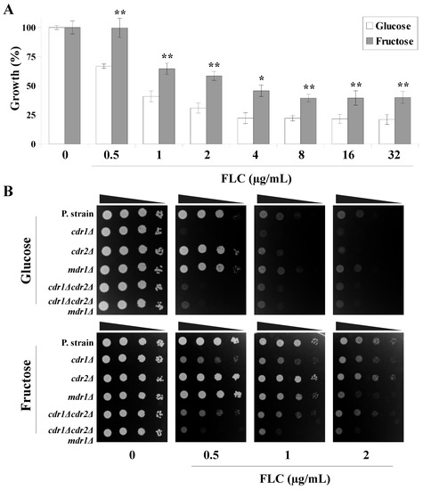 Figure 1. (A) Percentage of Candida albicans CAF2-1 cell growth in the presence of a range of fluconazole concentrations (FLC, 0–32 μg/mL). Cells were cultured with either yeast nitrogen base glucose (YNBG) or yeast nitrogen base fructose (YNBF) media for 24 h at 28 °C (mean ± SD, n = 3). Statistical analysis was performed by comparing the percentage growth between YNBG- and YNBF-grown cells at the same FLC concentrations (*, p < 0.05 and **, p < 0.01). (B) Growth phenotypes of C. albicans CAF2-1 (parental strain), DSY448 (cdr1Δ), DSY653 (cdr2Δ), DSY465 (mdr1Δ), DSY654 (cdr1Δcdr2Δ), and DSY1050 (cdr1Δcdr2Δmdr1Δ) strains after 48-h incubation at 28 °C. All strains were grown on either YNBG or YNBF media in the presence of a range of FLC concentrations (0–2 μg/mL).