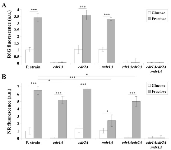 Figure 2. The activity of multiple drug resistance (MDR) transporters measured by (A) rhodamine 6G (R6G), or (B) Nile red (NR), efflux in C. albicans CAF2-1 (parental strain), DSY448 (cdr1Δ), DSY653 (cdr2Δ), DSY465 (mdr1Δ), DSY654 (cdr1Δcdr2Δ), and DSY1050 (cdr1Δcdr2Δmdr1Δ) strains grown in yeast nitrogen base glucose (YNBG) or yeast nitrogen base fructose (YNBF) media for 8 h at 28 °C. Fluorescence intensities (IFs) of extracellular dyes were normalized (=1 for the YNBG-grown CAF2-1 strain) (means ± SD, n = 3, a.u. – arbitrary units). Statistical analysis was performed between YNBG- and YNBF-grown cells or between different strains (*, p < 0.05, and ***, p < 0.001).
