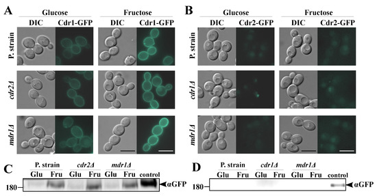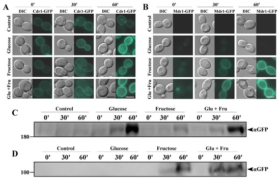 Figure 5. Fluorescence micrographs showing the subcellular localization of (A) Cdr1p-GFP in the C. albicans strain KS052 (CAF2-1 CDR1-GFP) or (B) Mdr1p-GFP in the C. albicans strain KS070 (CAF2-1 MDR1-GFP). Scale bar = 3 μm. Immunoblot analysis of (C) Cdr1p-GFP in C. albicans KS052 or (D) Mdr1-GFP in C. albicans KS070. In all the presented experiments, the C. albicans strains were grown in a yeast nitrogen base glucose (YNBG) medium for 8 h at 28 °C; starved in a HEPES-NaOH buffer for 1 h at 28 °C; and induced with 0.2% glucose, 0.006% fructose, or both sugars simultaneously (Glu + Fru) for 30 or 60 min.