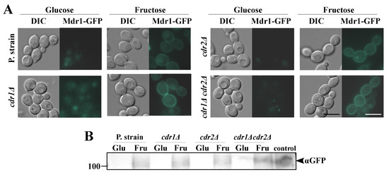 The results described in Section 2.1, together with previous reports, suggest that, in the case of glucose-grown C. albicans cells, Cdr1p is primarily responsible for the FLC tolerance, with negligible roles played by Cdr2p or Mdr1p [26,27]. However, in C. albicans cells grown on fructose, particularly in the case of strains positive for the MDR1 gene but negative for the CDR1 gene, we observed a high FLC tolerance (Figure 1B) and high NR efflux (Figure 2B). We concluded that these observations may result from the synthesis of Mdr1p in C. albicans cells as a result of the growth in the presence of fructose. In order to confirm those conclusions, we constructed a series of GFP-tagged C. albicans strains. We labeled Cdr1p-GFP in the cdr2Δ or mdr1Δ backgrounds; Cdr2p-GFP in the cdr1Δ or mdr1Δ backgrounds; and Mdr1p-GFP in the cdr1Δ, cdr2Δ, or cdr1Δcdr2Δ backgrounds (Table 1). We performed microscopic observations of the fluorescent signal in the constructed C. albicans strains grown in either glucose or fructose media, which were further validated by Western blotting (Figure 3 and Figure 4).