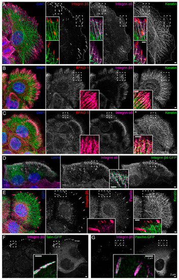 Keratin filaments are connected to hemidesmosomes, many of which are clustered next to focal adhesions. The fluorescence micrographs show antibody staining, nuclear 4′,6-diamidino-2-phenylindole (DAPI) staining (blue), and fluorescent reporters (at right in (D),(F),(G)) in methanol-fixed human keratinocytes (HaCaT). Enlargements of areas delineated by broken lines are shown as inserts. (A) The immunofluorescence images illustrate that the tips of keratin filament bundles localize next to but do not emanate from integrin β5-positive focal adhesions. Instead, peripheral keratin filaments co-localize with and connect integrin α6-positive hemidesmosomes (n = 8). (B,C) The pictures depict the co-distribution of bullous pemphigoid antigen 1 (BPAG-1) with integrin β4 and integrin α6 identifying the triple-positive structures as type I hemidesmosomes. Note, that they co-localize with peripheral keratin filament bundles, which are oriented along these extracellular matrix (ECM) adhesion sites (n = 7 and n = 11). (D) The images show two cells that were transfected with integrin β4-green fluorescent protein (integrin β4-GFP), which co-localizes with endogenous integrin α6 (n = 5). (E) The micrographs illustrate the co-distribution of integrin β5 with paxillin in focal adhesions and the lack of co-localization of focal adhesion markers with keratin filaments (n = 9). (F,G) The fluorescence recordings demonstrate that the fluorescent reporters talin-GFP and paxillin-GFP co-localize with integrin β5 in focal adhesions (n = 5 and n = 1). The image panels in (A–D) are maximum intensity projections of complete cells, and the image panels in (E–G) depict only the lower cell sections (also maximum intensity projections), where focal adhesions and hemidesmosomes are located.