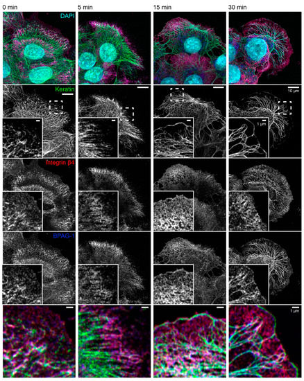 - Nahidiazar, L.; Kreft, M.; van den Broek, B.; Secades, P.; Manders, E.M.; Sonnenberg, A.; Jalink, K. The molecular architecture of hemidesmosomes, as revealed with super-resolution microscopy. J. Cell Sci. 2015, 128, 3714–3719. [Google Scholar] [CrossRef] [PubMed]