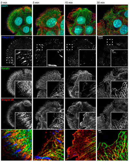 - Windoffer, R.; Beil, M.; Magin, T.M.; Leube, R.E. Cytoskeleton in motion: The dynamics of keratin intermediate filaments in epithelia. J. Cell Biol. 2011, 194, 669–678. [Google Scholar] [CrossRef]