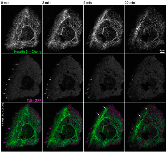 Human keratin 14-mCerulean was described before in Reference [30]. Murine talin-GFP ((GFP)-talin) was a kind gift from Wolfgang Ziegler (then at University of Leipzig, Germany [64]). EB3-GFP (end-binding protein 3-GFP) was a kind gift from Rainer Duden (Universität zu Lübeck, Germany [65]). mApple-Actin was a kind gift from James Nelson (Stanford University, Stanford, CA, USA).
