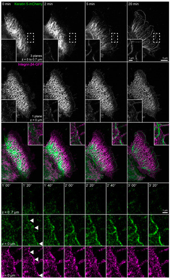 In this set of experiments, we wanted to find out whether the phenomena detected in the absence of actin filaments, microtubules and focal adhesions are also of relevance for cells containing these cytoskeletal components. To increase hemidesmosome formation, cells were grown to complete confluence, and migration was induced by a scratch with a 20 µL pipette tip. The wounded cell-layers typically started to close the wound within minutes. During migration of the cells, new focal adhesions and hemidesmosomes were formed at the leading edges and were disassembled at the trailing edges as previously described for migrating primary keratinocytes [29]. At the same time, new keratin filaments were formed preferentially at the leading edge that subsequently gained contact to the main cytoskeletal keratin network (Figure 7 and corresponding Video S7; also see References [44,51]). Shortly before the appearance of keratin particles, integrin β4-YFP clusters could be detected at the same positions. These nucleating keratin particles remained attached to the hemidesmosomal clusters. The nascent keratin particles subsequently elongated in one direction and interconnected hemidesmosomal protein clusters. The newly formed scaffold finally connected to pre-existing filaments of the more central keratin filament network.