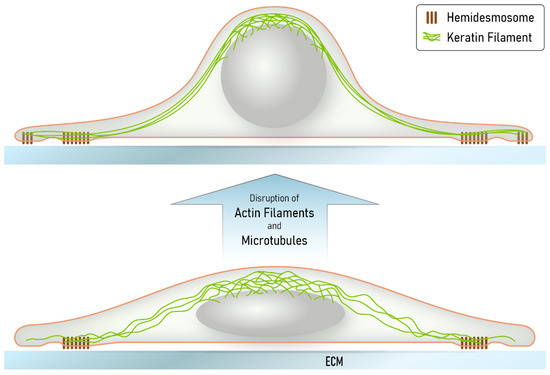 - Osmani, N.; Labouesse, M. Remodeling of keratin-coupled cell adhesion complexes. Curr. Opin. Cell Biol. 2015, 32, 30–38. [Google Scholar] [CrossRef] [PubMed]