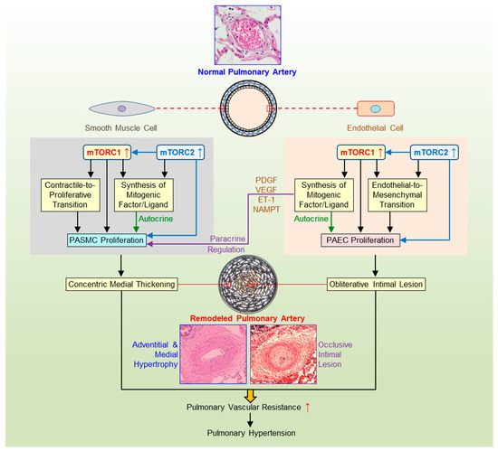 Pulmonary arterial smooth muscle and endothelial mTOR signaling in pulmonary vascular remodeling. Schematic diagram depicting the potential pathogenic role of the AKT/mTOR signaling in the development and progression of pulmonary hypertension (PH). Pulmonary vascular remodeling, such as concentric pulmonary arterial wall thickening due to pulmonary arterial smooth muscle (PASMC) proliferation and occlusive intimal lesions due to PASMC migration and pulmonary arterial endothelial cell (PAEC) injury and endothelial-to-mesenchymal transition (EndMT), is a major cause for the elevated pulmonary vascular resistance (PVR) and pulmonary arterial pressure (PAP) in patients with pulmonary arterial hypertension (PAH) and in animals with experimental PH. Activation of AKT/mTOR signaling or increased mTORC1 and mTORC2 activity in PASMC promotes contractile-to-proliferative phenotypic transition and enhances PASMC proliferation, which result in concentric pulmonary vascular wall medial hypertrophy and thickening. Activation of AKT/mTOR signaling or increased mTORC1 and mTORC2 activity in PAEC promotes EndMT, while EndMT-derived fibroblasts are involved in the development of occlusive intimal lesions and neointimal formation resulting in obliterative occlusion in small vessels. The mTORC1/mTORC2-mediated increases in gene expression and protein translation in PASMC and PAEC also enhance the synthesis and release of mitogenic factors (e.g., PDGF, VEGF, NAMPT) and ligands (e.g., ET-1) and stimulate PASMC/PAEC proliferation via autocrine and/or paracrine mechanisms. The mTORC1/mTORC2-mediated upregulation of membrane receptors, ion channels, and inflammatory ligands is also involved in the development concentric medial thickening and obliterative intimal lesions. PDGF, platelet-derived growth factor; VEGF, vascular endothelial growth factor; NAMPT, nicotinamide phosphoribosyltransferase; ET-1, endothelin-1.
