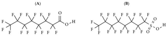 Chemical structures of perfluorooctanoic acid (PFOA) (A) and perfluorooctane sulfonic acid (PFOS) (B).