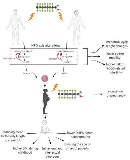 Alterations in hypothalamic–pituitary–gonadal axis functions with potential health effects caused by per- and polyfluoroalkyl substances (PFASs) exposure [32,44,46,151,152,153,154].