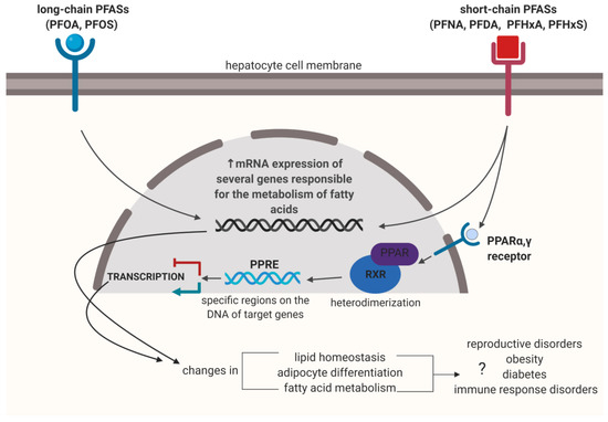 Potential molecular mechanism of PFASs hepatotoxicity. In liver cells, PFASs activate peroxisome-proliferator-activated receptor (PPAR), which induces heterodimerization with retinoid x receptor (RXR). Complex binds to specific sequence of DNA–PPREs (peroxisome-proliferator hormone-response elements), which occurs in the promoter region of a gene and modulate transcription. Based on papers of Reference [170].