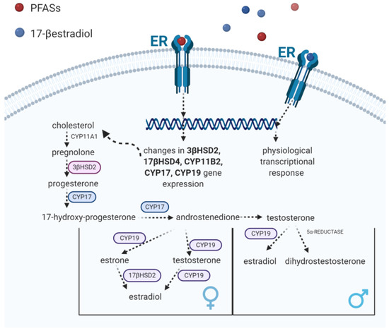 - In vivo and in vitro studies have reported that PFASs can bind to nuclear receptors, such as estrogen receptors (ERs), androgen receptor (ARs) and thyroid hormone receptor (TRs); therefore, they are can alter steroidogenesis.