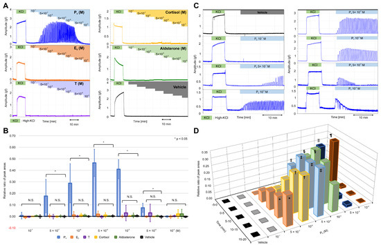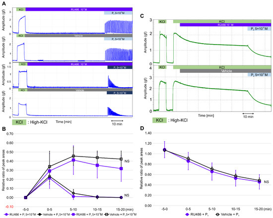 First, we evaluated the possible stimulatory effects of steroid hormones, including progesterone, on the contractile activity of the resting myometrium. In nonpregnant women, the serum concentration of progesterone is known to be 10−7 M in the secretory phase; however, this level increases to 10−6–10−5 M during pregnancy. In rats, the concentration of progesterone is reported to increase to 5 × 10−7 M during pregnancy [24]. We evaluated the effect of sequentially increasing progesterone levels in physiological saline solution (PSS; >10−7 M) on the contractile activity by measuring the peak area of contraction, representing frequency, tension (amplitude), and contractile time (Figure S1A,B). The peak area of high-KCl-induced contractions was used as a reference, and the contractile activity was evaluated using the relative ratio of the peak area (RRPA; steroid hormone-induced peak area/high-KCl-induced peak area) as the absolute values of the peak area varied largely between the myometrial strips obtained from different rats.
