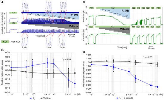 Progesterone did not enhance the high-KCl-induced contractions but inhibited the contractions in a concentration-dependent manner at a concentration >5 × 10−7 M and completely at the concentration >5 × 10−5 M (Figure 2C). After the sixth medium exchange, the response to high KCl was recovered to previous levels; however, the vehicle did not affect the high-KCl-induced contraction, and the response to a high-KCl concentration was recovered immediately after the exchange. The RRPA of the high-KCl-induced contractions was significantly lower in the progesterone group (n = 6, mean ± SD) than in the vehicle group (n = 6, mean ± SD) at the concentration >5 × 10−7 M (Figure 2D and Table S3) and decreased in a concentration-dependent manner.