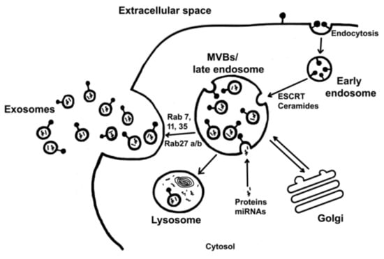 Exosomes are formed by the endosome system involved in sorting and transporting cellular vesicles to their location (Figure 1). Early endosomes mature into late endosomes. During this process, the endosome contents are acidified due to the V-ATPase proton pump’s operation. They also lose Rab5 and acquire Rab7 and Rab9, which, together with the mannose-6-phosphate receptor, are markers of late endosomes []. Intraluminal vesicles (ILVs) are constitutively formed by inward budding of the endosome membrane and are accumulated in endosome cavities [].