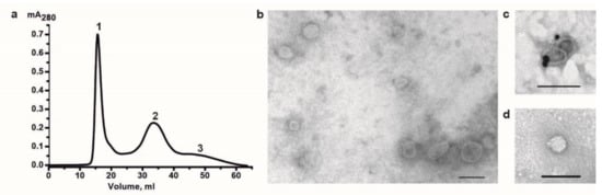 We have developed a protocol for isolating highly purified exosome preparations from the human placenta, including ultracentrifugation and ultrafiltration through a 0.1 µm filter, supplemented by size-exclusion chromatography on Sepharose 4B []. Exosomes obtained according to a standard protocol without gel filtration contain exosomes and many vesicles larger than 100 nm, “non-vesicles”, i.e., rounded particles without a limiting membrane (Supplementary Materials Figure S1). Size-exclusion chromatography using Sepharose 4B significantly reduces the number of co-isolating proteins and “non-vesicles” (Figure 2) []. After size-exclusion chromatography, the preparations of placental exosomes were shown by flow cytometry to contain ~78% of CD9+-exosomes and ~74% of CD81+-exosomes []. The exosome yield after size-exclusion chromatography was comparatively high (up to ~93%). Hence, this method does not lead to the loss of a large part of exosomes.