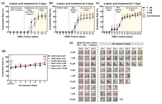 Variation of the contraction rate of the samples as a function of the air exposure 3, 5, and 7 days with the different concentrations (0, 1, 10 µM) of α-lipoic acid. The graph is the contraction rate of the group treated with α-lipoic acid for (a) 3 days, (b) 5 days, and (c) 7 days under air exposure culture conditions. The legends in the graphs (a–c) are the same. (■, 0 µM α-lipoic acid; ●, 1 µM α-lipoic acid; and ▲, 10 µM α-lipoic acid) (d) It is a graph comparing only the contraction rate of the 8th day, which is the period of coculture to dermis and epidermis, and the air exposure period of which α-lipoic acid was treated (maximum processing period for α-lipoic acid is 7 days). The change was represented by a linear curve during the α-lipoic acid processing period. (e) Photographic images of the samples following air exposure for the different concentrations of α-lipoic acid (bar = 8 mm).