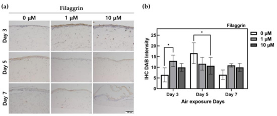 Considering the results of IHC staining of filaggrin, as presented in Figure 3, there was a clear difference between the 0 μM control group and ALA-treated HSE group at day 3. In the ALA-treated HSEs, the thickness of the epidermis layer was relatively thick, and the expression area and expression intensity of filaggrin were high. In the group on the third day, the culture period remained short, and epidermis formation was thin. On the 7th day, the thickest epidermis formation was observed, and the filaggrin region was wide and well formed. Through filtering and quantifying only DAB staining using ImageJ, we observed that the group on the 5th day exhibited the highest protein expression. On days 3 and 7, filaggrin expression was relatively high in the ALA-treated group. HSEs treated with ALA for 7 days showed 1.5 times higher expression than the control. There was a significant difference (p < 0.05) between the untreated group at 1 μM at day 3 and at 10 μM at day 5.