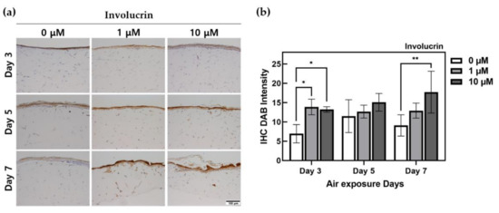 Immunohistochemistry-stained images for involucrin of HSEs treated α-lipoic acid concentration of 0, 1, and 10 μM. (a) This is the result of involucrin expressed by IHC staining in HSEs. The x-axis is listed by ALA-treated concentration, and the y-axis is listed by ALA-treated period. The scale bar is 100 μm. (b) This is a graph of quantification of DAB intensity for immunohistochemistry staining of involucrin protein using the ImageJ program. (n = 4; *, p < 0.05; **, p < 0.01 vs. 0 μM for each period).