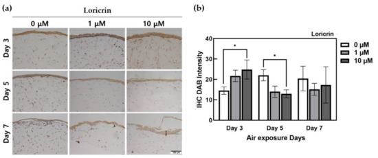 However, loricrin showed overall and stained results, as shown in Figure 5. Using ImageJ, filtering was performed according to the range of high expression intensity, and only the DAB-staining intensity in the region where the target protein was expressed was confirmed. According to the quantification of DAB staining in the target portion, an increase in expression due to ALA treatment was observed from the 3rd day. In addition, decreased loricrin expression was observed in the ALA-treated group. In particular, a sharp decrease was observed from the 5th day. There was a significant difference (p < 0.05) between HSEs treated with 10 μM ALA at day 3 and the untreated control group.