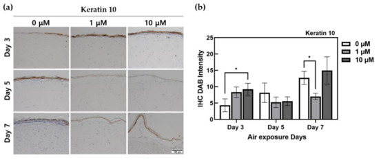 Immunohistochemistry-stained images for keratin 10 of HSEs treated α-lipoic acid concentration of 0, 1, and 10 μM. (a) This is the result of keratin 10 expressed by IHC staining in HSEs. The x-axis is listed by ALA-treated concentration, and the y-axis is listed by ALA-treated period. The scale bar is 100 μm. (b) This is a graph of quantification of DAB intensity for immunohistochemistry staining of Keratin 10 protein using the ImageJ program. (n = 4; *, p < 0.05 vs. 0 μM for each period).