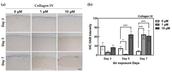 Immunohistochemistry-stained images for collagen IV of HSEs treated α-lipoic acid concentration of 0, 1, and 10 μM. (a) This is the result of collagen IV expressed by IHC staining in HSEs. The x-axis is listed by ALA-treated concentration, and the y-axis is listed by ALA-treated period. The scale bar is 100 μm. (b) This is a graph of quantification of DAB intensity for immunohistochemistry staining of collagen IV protein using the ImageJ program. (n = 4; *, p < 0.05; ****, p < 0.0001 vs. 0 μM for each period).