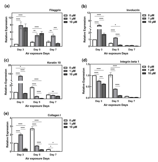 Relative quantification was performed by comparing the gene expression levels with respect to the difference in the ALA-treatment concentration among the ALA-treated groups. Because the throughput and culture period of ALA-treated HSEs are different in all experimental groups, it is assumed that there are differences depending on the culture period and drug treatment conditions. As a control for the relative quantification of qPCR, the 0 μM condition on the third day, which had the shortest culture period and was not affected by ALA, was used. Since KCs react relatively sensitively to ALA, as confirmed through advanced histological staining, the results were analyzed with an emphasis on the epidermis layer. We analyzed changes in the expression of the involucrin (IVL), ITGB1 (integrin beta1), filaggrin (FLG), and KRT10 (keratin 10) genes, which are the major genes expressed in the epidermis. We compared COL1A (collagen I), which is an important gene for ECM formation in the dermis.
