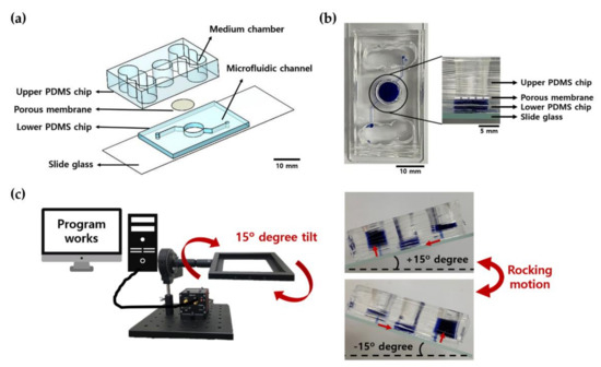A gravity flow system was used to create a 3D culture in a fluid environment. As shown in Figure 9c, the system consists of a PC for driving, a motor, and a dish holder that can transmit movement to the chip, and a program is used to control the required tilt angle and rotation frequency. When the set time elapses, the badge can be effectively recirculated by causing the culture solution to flow in the opposite direction while tilting in the opposite direction. The flow rate of the culture medium in the microfluidic channel can be controlled mainly by adjusting the tilting angle, and the volume flow rate was 10 μL/min when the tilting angle was 15° [53].