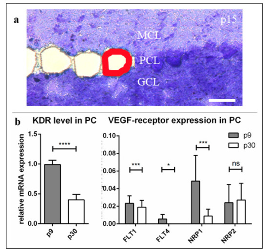 mRNA-expression levels of vascular endothelial growth factor (VEGF)-receptors in the course of Purkinje cells (PC) development. P9, (a) p9, p15, and p30 PCs were laser microdissected (red line) at 20× magnification and subjected to the method of qRT-PCR. (b) For relative quantification of FLT1 (VEGFR-1), KDR (VEGFR-2), FLT4 (VEGFR-3), NRP1 and NRP2, the 2(–ΔΔCt) method was conducted using GAPDH for normalisation. Relative mRNA expression is shown in relation to KDR at p9. Data are provided as means ± SEM and were tested for significance using Student’s t-test. Significant differences are indicated by ns (p > 0.05), * (p ≤ 0.05); *** (p ≤ 0.001), **** (p ≤ 0.0001), n = 3. Scale bar: (a) 50 µm.