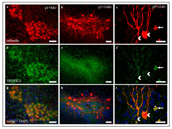 VEGFR-2 expression in organotypic slice cultures at p1 + 8 div, p1 + 14 div, and p9 + 21 div. (a–i) Immunostaining of calbindin positive PC (red), VEGFR-2 (green), and cell nuclei (blue) in organotypic cerebellar slice cultures at p1 + 8 div, p1 + 14 div, and p9 + 21 div. VEGFR-2 is detectable in PC soma and dendrites in all development stages. (c,f,i) Exemplary, two PC soma (white arrowheads) and some cell detritus (died PC, white arrows) are marked. The same exposure settings were used for all exposures and no post-correction was applied. Scale bars: 100 µm.