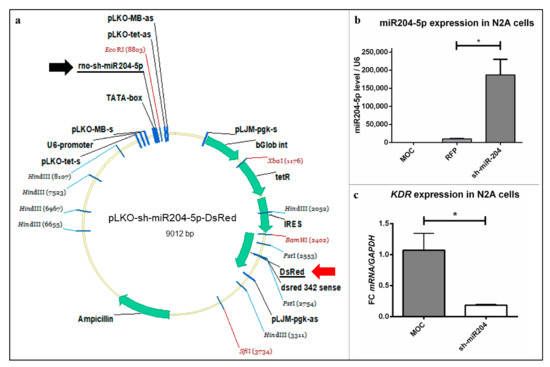 2.3. sh-miR204-5p Construct Causes miRNA Overexpression and KDR Suppression in N2A Cells