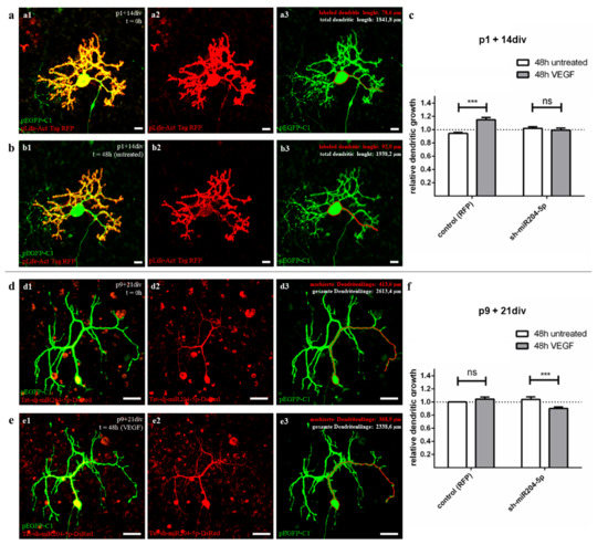 Morphometric analysis of miR204-5p effects on VEGF controlled dendritic growth in juvenile and mature PC. (a,b) Exemplary presentation of dendritic length analysis of PC at the age of p1 + 14div (group 2) injected with pEGFRP-C1 (green) and pLife-Act Tag RFP (red) before (a) and after 48 h untreated incubation (b). (d,e) Example of a PC at age p9 + 21div, injected with pEGFRP-C1 (green) and pLKO-miR204-DsRed (red) before (d) and after 48 h incubation with 0.1 ng/µL VEGF (e). The total dendritic length was measured for each cell that showed both sufficient red and green signal (one dendrite is shown in red for each cell before and after treatment as an example), and relative dendritic growth (RDG) was calculated. (c f) Effects of miR204-5p on VEGF-controlled dendritic growth in juvenile (c) and mature PC (f). Changes in dendritic growth are given in relative ratio (RDG = (dendritic length at t = 0 h)/(dendritic length at t = 48 h)); data are given as mean values ± SEM. Cells injected with pLife-Act Tag RFP only are defined as controls representing the natural VEGF reaction compared to the sh-miR204-5p injected PC. Significant differences are indicated by *** p < 0.0001, ns p > 0.05; n ≥ 9 (each bar). Scale bars: (a,b) 20 µm (d,e) 50 µm.