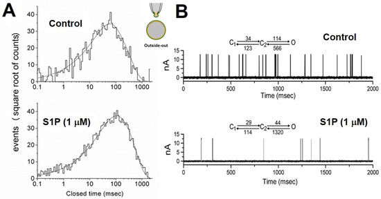 Effects of S1P on BKCa kinetics in outside-out patches (as inset). (A) The effects of S1P on mean closed times of BKCa at +60 mV. The pipette solution containing 0.1 µM Ca2+, the cells were bathed in a high-K+ bathing solution with 1.8 mM CaCl2. The closed time histograms in the control (upper) and after the application of S1P (1 µM, lower) are illustrated. The abscissa and ordinate show the logarithm of apparent open or closed times (ms) and the square root of the number of counts, respectively. (B) Simulated single-channel currents in the control (upper) and S1P (lower). Simulation models used to analyze the observed data measured at +60 mV are shown in the upper part of each simulated current. Each horizontal arrow pointing to the left represents the binding of S1P or closing of a channel, and each arrow to the right represents the dissociation of S1P or opening of a channel. The units are µM/ms or /ms. O: Open state; C1 and C2, two closed states.