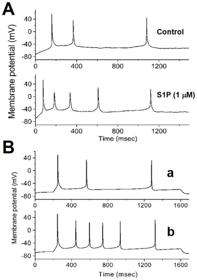 Effects of S1P on action potentials (APs) and simulated AP of a modeling chromaffin cell. (A) Current-clamp conditions were performed with the current injection of 2 nA applied to the cell with a duration of 1.6 s. The cells were bathed in a normal Tyrode solution with 1.8 mM CaCl2. Potential traces were recorded in the control and exposure to S1P (1 µM). (B) The simulated APs were generated from a cell model which mimics the electrical behavior of chromaffin cell. A current injection at the 4.6 nA with 1.4 s duration was applied. S1P (1 µM) was mimicked IK(Ca) by the maximal conductance (gK(Ca)) from 0.64 (a) to 0.32 nS (b).