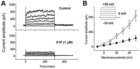 Inhibitory effect of S1P on IK(Ca) in PC12 cells. (A) Superimposed current traces obtained in the control and presence of S1P (1 µM). The cells were bathed in a normal Tyrode solution with 1.8 mM CaCl2, and the pipette solution containing 0.1 µM Ca2+. (B) Averaged I-V relations of current amplitudes measured at the end of voltage pulses in the absence (◯) and presence (⬤) of 1 µM S1P. Each point represents the mean ± SEM (n = 6, in three cultures).