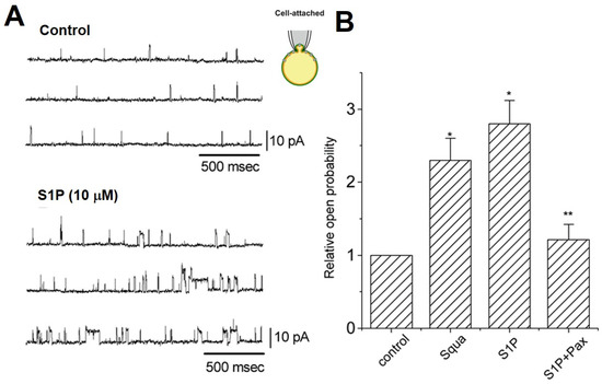 S1P-induced BKCa activation in the cell-attached configuration of PC12 cells. (A) The cells were bathed in a high-K+ bathing solution with 1.8 mM CaCl2, holding at +60 mV. The original current traces were obtained in the control and 3 min after the S1P (10 µM) application. (B) Summary of the effects of squamocin (Squa, 10 µM), S1P, and S1P combined with paxilline (Pax, 1 µM) on the BKCa open probability. The BKCa activity in the control was considered to be 1.0 and the relative open probability by each agent was plotted. Asterisks indicate significant differences (p < 0.05, * control, and ** S1P alone group, n = 5−9, in three cultures).
