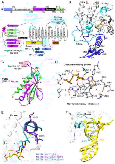 The structure of METTL16. (A) Scheme of the overall domains’ organization and topology diagram of human METTL16 [,] (B) The 3D structure of METTL16 is a composite of three superposed models: apo-METTL16-MTD (PDB ID: 6b91), METTL16-MTD/SAH (6gfn), METTL16-MTD/RNA (6du4)—RNA is not shown; METTL16 is shown as ribbons and structural elements are color-coded as in panel A. Dashed cyan line represents disordered residues 189–213 (R-loop) in apo form of METTL16-MTD. (C) Crystal structure of vertebrates conserved regions (VCRs) located in the C-terminal domain of METTL16; the arginine-rich region is indicated. The dashed black line represents predicted disordered residues 402–498. (D) The network of interactions secures the orientation of SAH in the METTL16 coenzyme binding pocket. The model presents interactions in the 2h00 structure (residues-gray, SAH-orange) and superposed 6gfk (transparent gray). Residue T216 (turquoise) is modeled from METTL16-MTD/hp1x (6du4) structure. Black dashed lines show direct interactions between METTL16 and the coenzyme, contacts mediated by water molecules (red/gray dots) are shown by gray dashed lines. (E) Conformational rearrangement of the K-loop between apo-METTL16-MTD (6b91, dark purple), METTL16-MTD/SAH (6gfn, dark pink) and METTL16-MTD/hp1x (6du4, turquoise) complexes. Upon RNA binding K163 is placed inside the SAM binding pocket. The K-loop is highlighted and shown by ribbon representation; crucial residues of this motif, K163 and M167, are presented as sticks. (F) The R-loop in the METTL16-MTD/hp1x complex (6du4, turquoise) is shown in ribbon representation. R200 is shown as sticks. Dashed dark purple line represents the disordered R-loop existing in the apo structure of METTL16. All molecular figures were created using UCSF Chimera [].