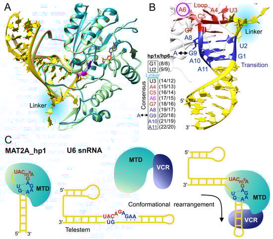 Interaction between METTL16 and RNA methylation substrates. (A) Superposition of two crystal structures of METTL 16-MTD/RNA complex, PDB ID: 6du4 (METTL16, turquoise; hp1x, gold), 6du5 (METTL16, light green; hp6, light yellow); the acceptor adenosine is shown in magenta; SAH is superimposed from the structure 6b92 and shown as sticks (orange). The linker differentiating the loop-transition region of hp1x and hp6 is highlighted by light blue. (B) The hp1x of METTL16-MTD/RNA complex (6du4) is shown in atoms-ribbon representation. The 3′ part of the loop and the transition region are marked by red and blue colors, respectively. The acceptor adenosine is manifested by the magenta circle. The linker between the transition region and the loop is highlighted by light blue. METTL16 is shown by a transparent white ribbon. The conserved sequence of the loop-transition structure is numbered 1–11, with 6 (magenta) representing the acceptor adenosine. Schematic representation of loop-transition region (inset) shows conserved residues (1–11, box) and corresponding nucleotides in hp1x and hp6 models. The arrow indicates the G/A substitution in hp5. (C) A schematic diagram of the interaction between METTL16 and its RNA substrates ([], figure modified): MAT2A mRNA and U6 snRNA. The loop and transition regions are marked as in panel B. The VCRs of METTL16 associate with U6 and rearrange the substrate to obtain the conformation optimal for methylation.