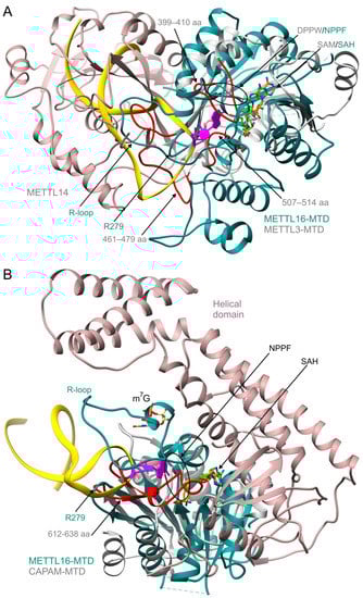 Structural comparison between METTL16 and METTL3/METTL14 reveals similar global architecture of METTL16 and METTL3 catalytic domains, while their sequences share no significant similarity [,,,]. Superposition of METTL16-MTD in complex with RNA substrate (PDB ID: 6du4) and METTL3-MTD (5il1) has shown that the catalytic motifs, 184NPPF187 of METTL16 and 395DPPW398 of METTL3, as well as the coenzyme binding sites, overlap well (Figure 3A). However, the stem structure of the METTL16 substrate (hp1x) would clash with the METTL14 subunit (Figure 3A). It is not surprising, as RNA targets of both enzymes are distinctly different [,,,]. Three fragments of METTL3, involving residues 399–410, 461–479, and 507–514, map to the same face of the protein structure as the METTL16 RNA-binding site (Figure 3A) [,]. Interestingly, the 399–410 and 461–479 fragments of METTL3 correspond to the R-loop and R279 of METTL16, respectively. Given that these elements of METTL16 are essential for interaction with RNA and methylation, equivalent motifs exposed on the METTL3/METTL14 interface may have similar roles but use a different mechanism of substrate recognition.