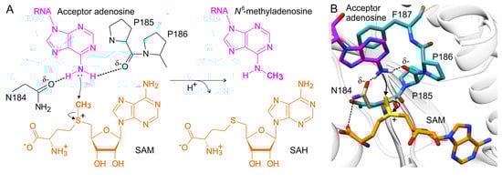 m6A methyltransferases contain the conserved motif [DNSH]PP[YFW] located near the SAM binding pocket and the methylated adenosine [,,]. Residues within the NPPF region of METTL16 are essential for m6A methylation, as METTL16 N184A, PP185/186AA, and F187G mutants were not able to methylate U6 and MAT2A RNA substrates in vitro (Table 1) [,]. Here, I present a model of methyl transfer reaction based on the published structure of METTL16-MTD/hp1x complex (PBD ID:6du4) and METTL16-MTD/SAH (2h00); SAM position was inferred from SAH. First, the acceptor adenosine is positioned in the active site of METTL16. The proper placement of adenosine is conditioned by π-π stacking with the aromatic side chain of F187. The N6 amino group of the adenosine is negatively polarized by the N184 Oδ atom and the P185 carbonyl oxygen of METTL16 through hydrogen bonding. As an effect of the N6 amino group polarization, it withdraws the methyl group from SAM via an SN2 mechanism (Figure 5A) [,]. Notably, the Oδ atom of N184 and N6 amino group of acceptor adenosine in METTL16-MTD/RNA complex locate ~5 Å from one another—too far for hydrogen bonding. However, in the METTL16-MTD/SAH complex (PDB ID: 2h00), the N184 side-chain conformation is different, placing the N184 Oδ atom and N6 amino group of adenosine within a 3-Å distance—short enough for an interaction. The conformation of the N184 side chain favoring hydrogen bonding with adenosine is forced by the interaction between the amino group of N184 and the carboxylic group of SAH/SAM (Figure 5B). The same orientation of the N184 side chain was observed in other crystal structures of METTL16-MTD in complex with SAH (PDB ID: 6gfk, 6gfn) [].