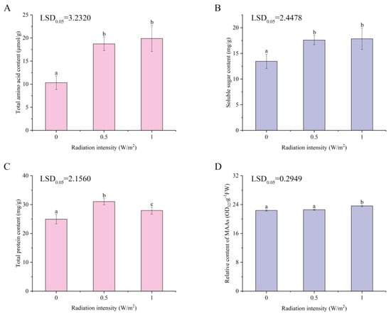 2.2. Effects of UV-B Irradiation on Total Amino Acids, Soluble Sugar, Total Protein, and MAAs of P. haitanensis
