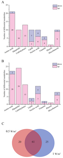2.3. Analysis of Differential Metabolites of P. haitanensis under Different UV-B Radiation Intensities