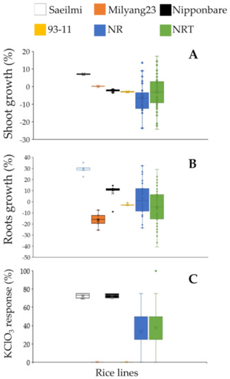 - Kabange, N.R.; Park, S.-Y.; Shin, D.; Lee, S.-M.; Jo, S.-M.; Kwon, Y.; Cha, J.-K.; Song, Y.-C.; Ko, J.-M.; Lee, J.-H.J.A. Identification of a Novel QTL for Chlorate Resistance in Rice (Oryza sativa L.). Agriculture 2020, 10, 360. [Google Scholar] [CrossRef]