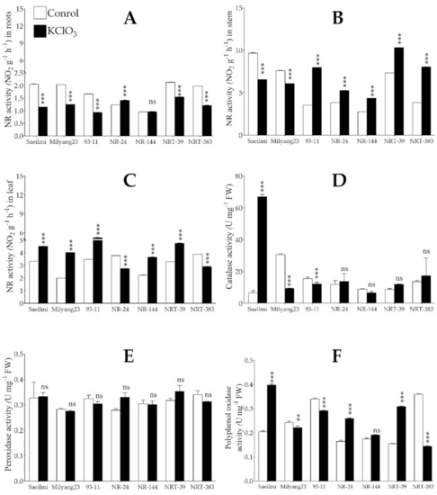 - LaBrie, S.T.; Wilkinson, J.Q.; Crawford, N.M. Effect of chlorate treatment on nitrate reductase and nitrite reductase gene expression in Arabidopsis thaliana. Plant Physiol. 1991, 97, 873–879. [Google Scholar] [CrossRef] [PubMed]