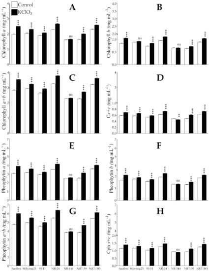 2.3. Increased Chlorophyll and Carotenoids Content in Response to Potassium Chlorate