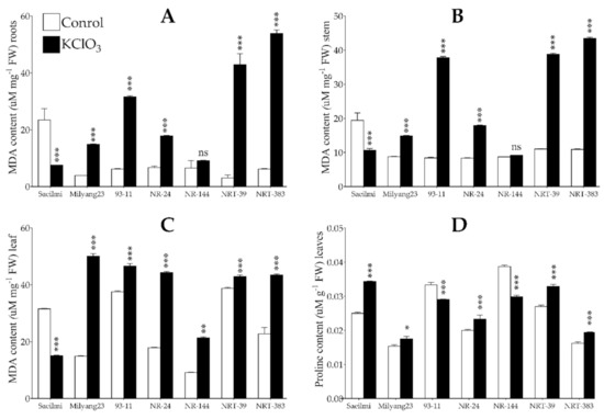 2.4. Potassium Chlorate Treatment Caused Lipid Peroxidation and Changes in Proline Content