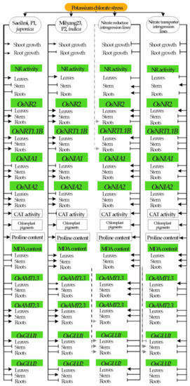 - Zhao, C.-m.; Hasegawa, H.; Ichii, M. A chlorate resistant mutant of rice (Oryza sativa L.) with normal nitrate uptake and nitrate reductase activity. Breed. Sci. 2000, 50, 9–15. [Google Scholar] [CrossRef]